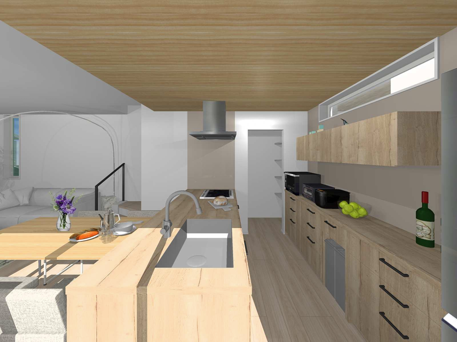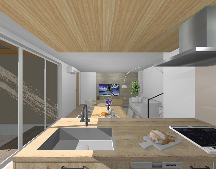 キッチンの天井の高さを変えることで空間にメリハリを。