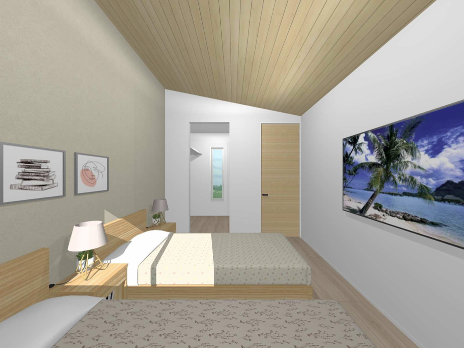 ▶ゆるやかな勾配天井が、空間にやさしい広がりをもたらす寝室。