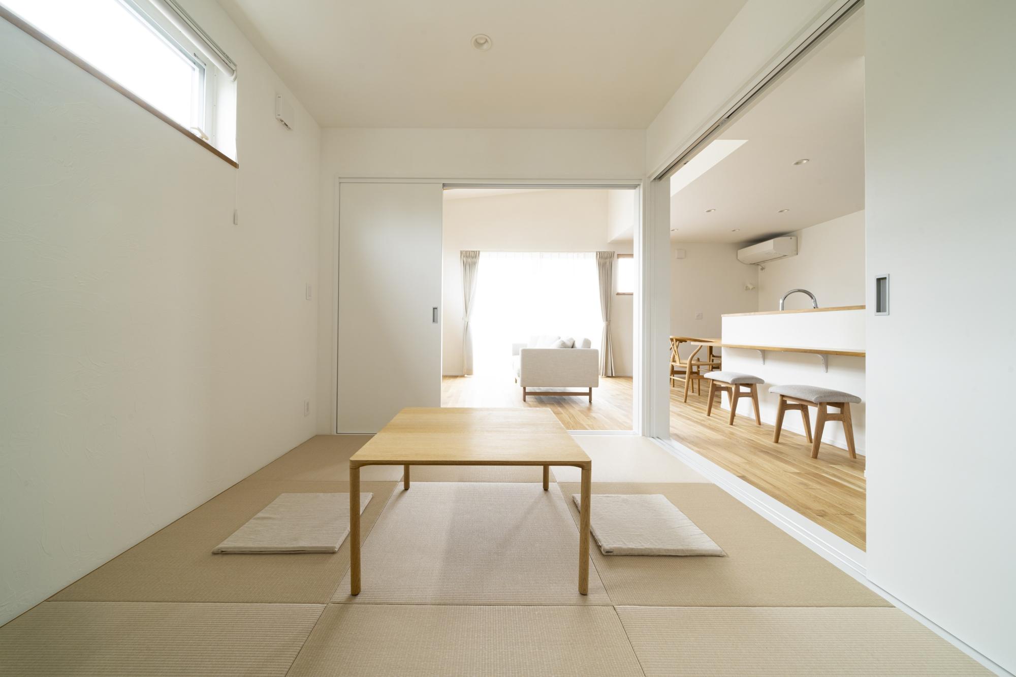 キッチン正面の小上がり和室や、外からの視線を気にせず過ごせるプライベート中庭、そして1階に寝室を設けた半平屋の設計など。