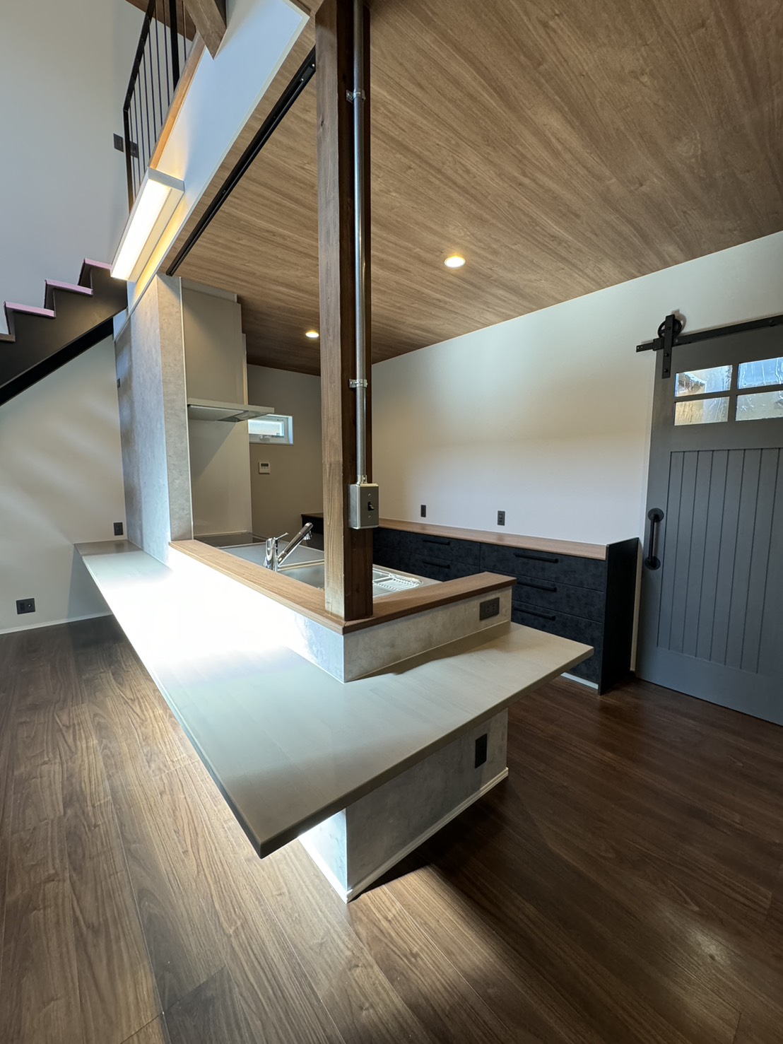 ▶キッチンとダイニングテーブルが一体型となった存在感のあるキッチンスペース。