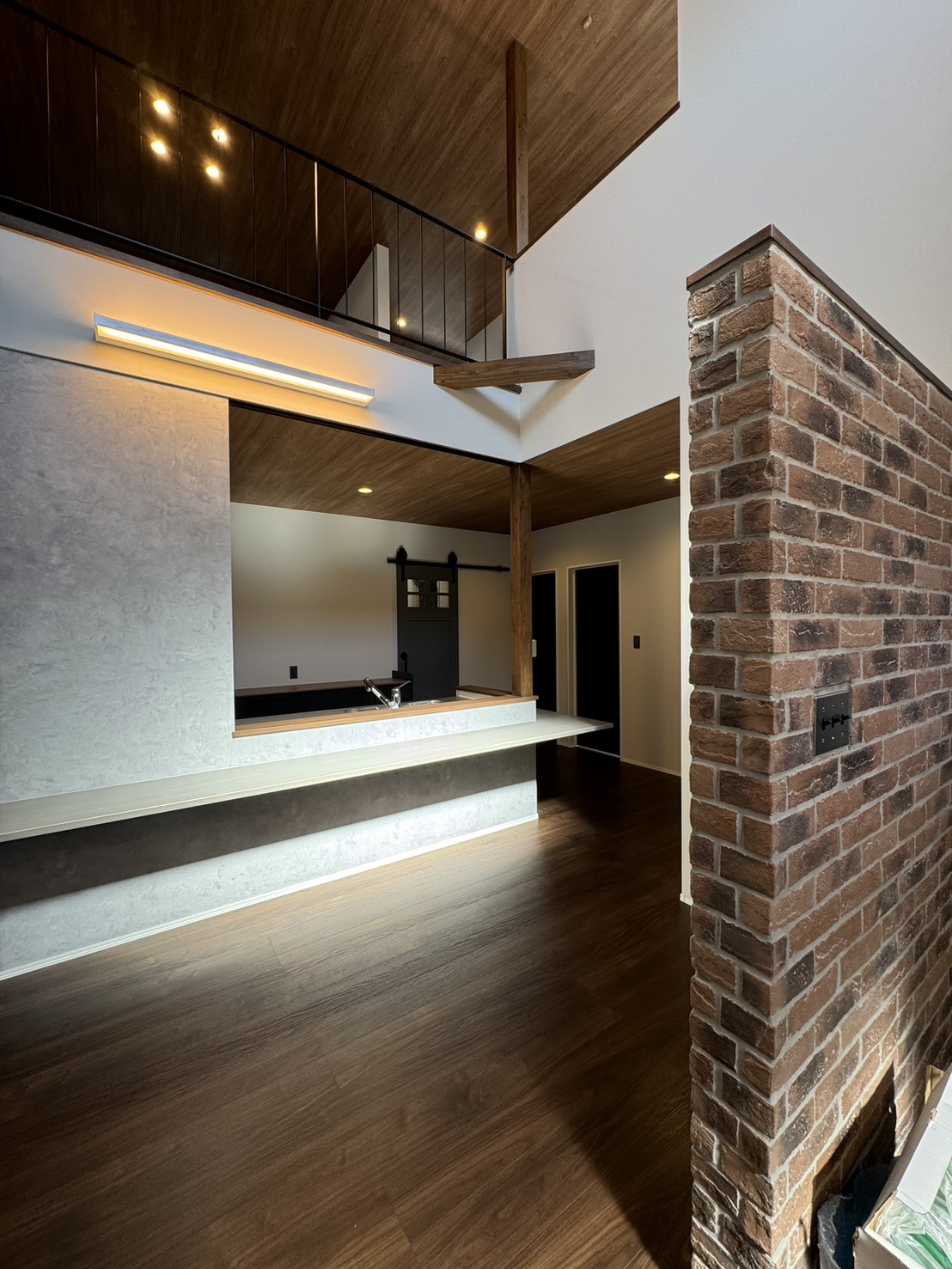 ▶玄関を開けると、視界に広がる開放的な吹き抜けと、海外の住まいを思わせるおしゃれな「レンガ壁」を採用。