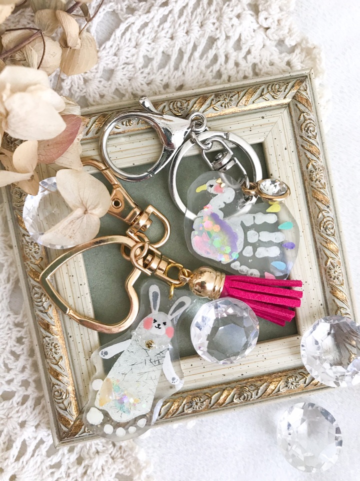 お子様の手形足形をかわいいキーホルダーに仕上げます♪レジンを使うのでぷっくりつるんとした仕上がりに!