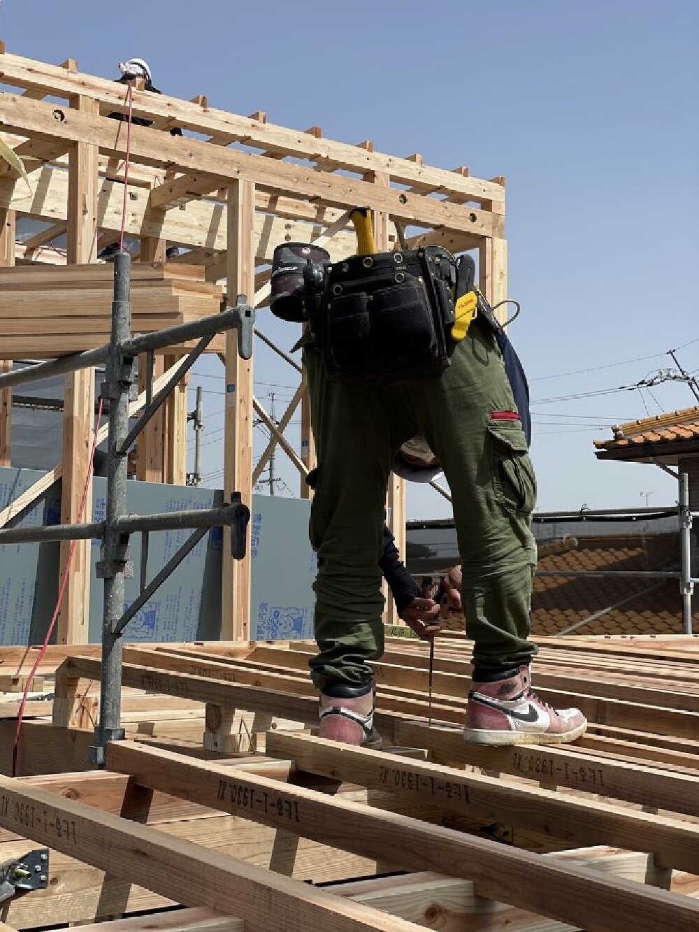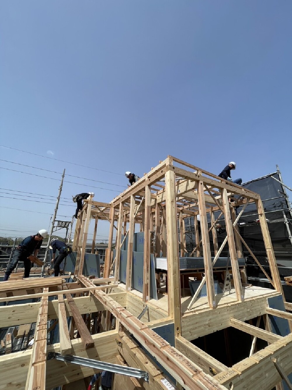土台の上に柱が次々に立ち始め、棟上げが着々と進められています。