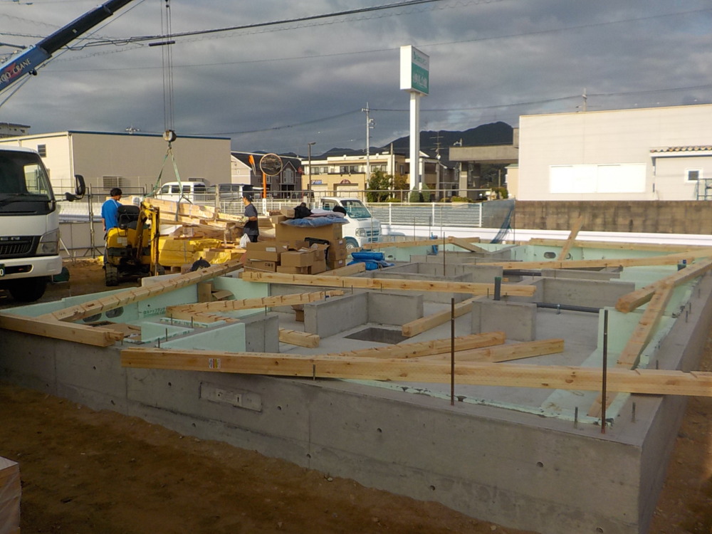 2階の床が施工され、1階と同様に柱を建てていきます。