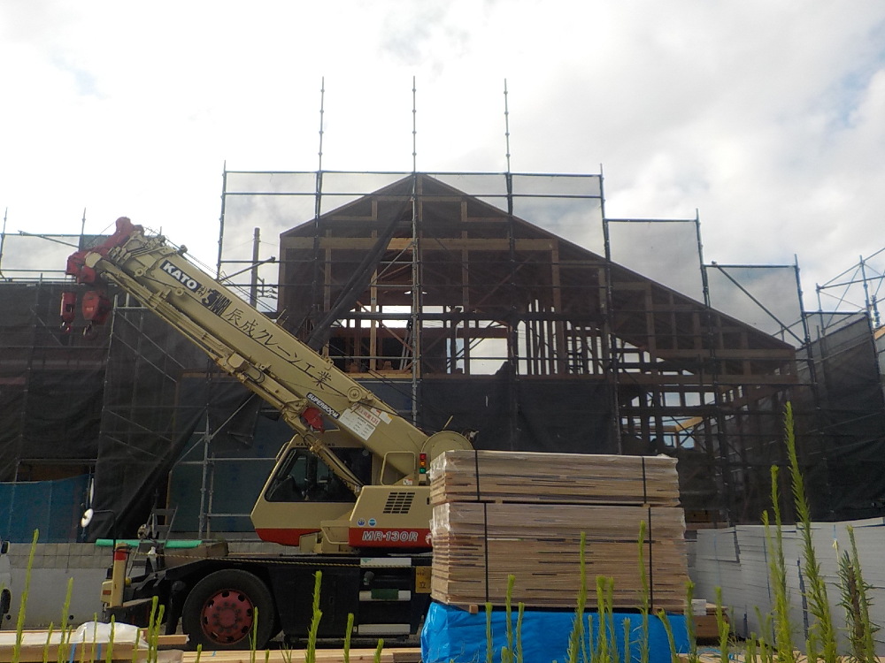 職人さんとレッカー車の息の合った連携プレーも上棟での見どころです(*'▽')