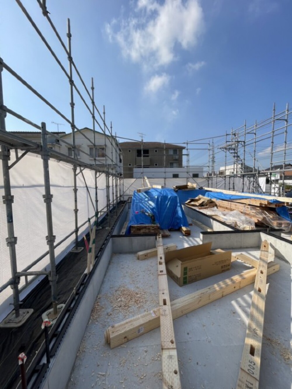 土台の上に柱が次々に立ち始め、棟上げが着々と進められています。