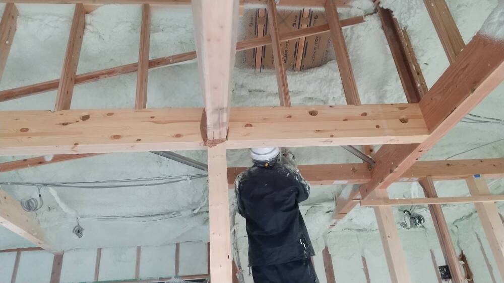 屋根の下地となる野地合板を貼った後、屋根下葺材「アスファルトルーフィング」が施工されました。
