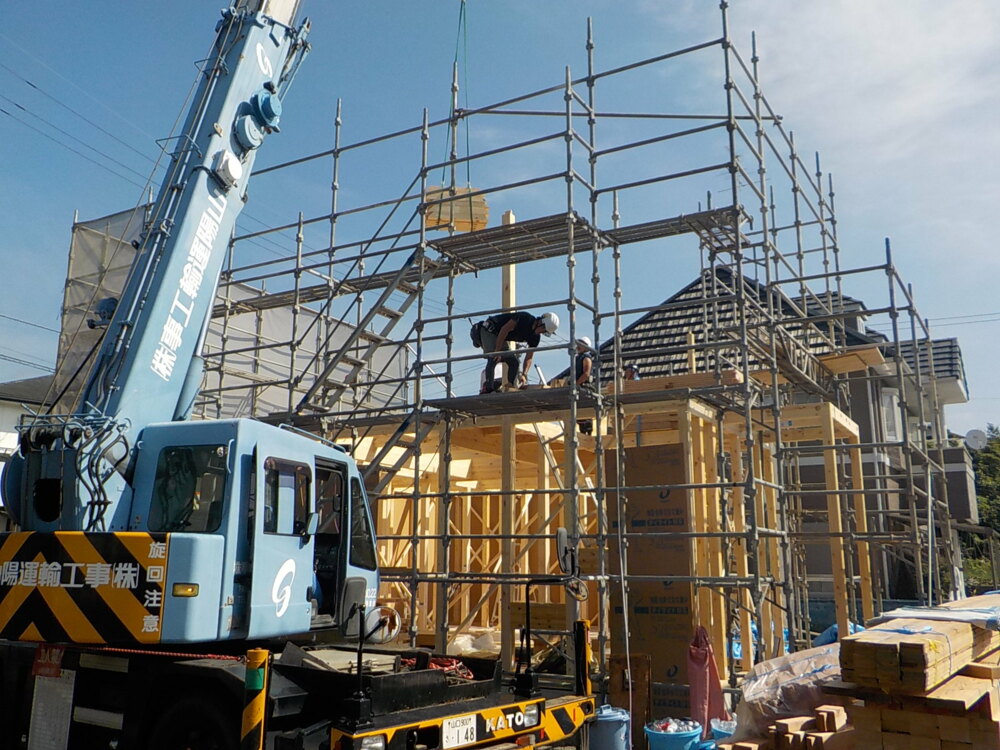 職人さんとレッカー車の息の合ったプレーは上棟の見どころの一つです。