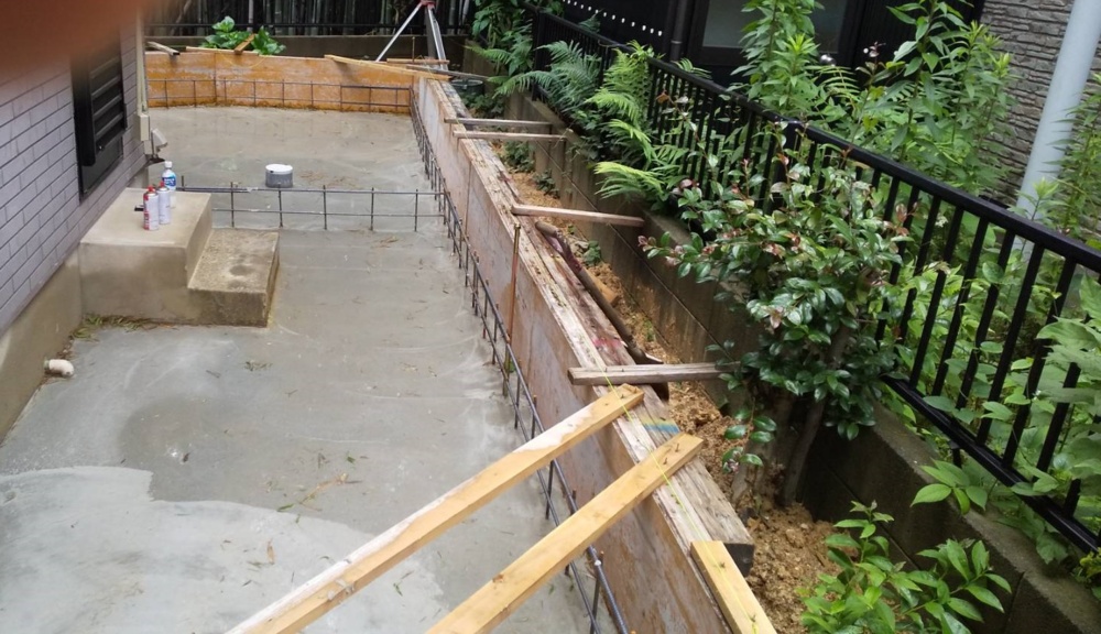 コンクリートが固まりましたので、立ち上がりの枠を組んでいき、コンクリートを流し込んでいきます。。