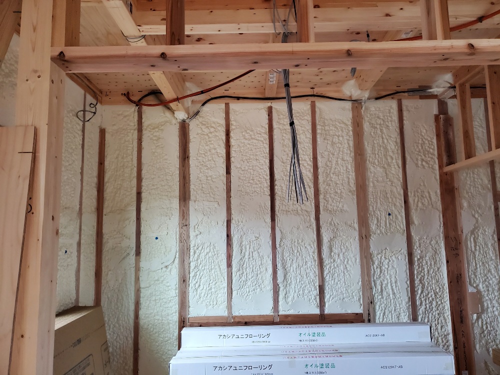 断熱材アクアフォームの吹付を行いました。アクアフォームは水を使って発砲させ吹き付けるタイプの断熱材です。隅々まで施工できるため気密性が高く、優れた断熱性能を長期にわたって維持できます。