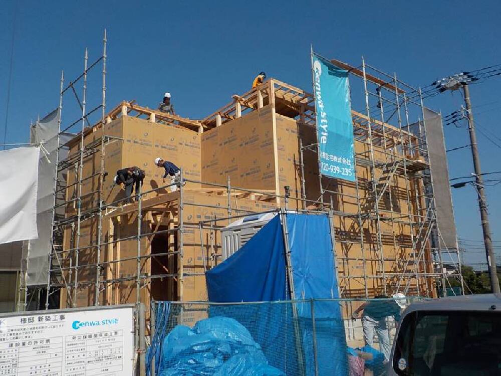 全体に耐力面材を付けていきます。横からの力(台風や地震)になどに抵抗し、大切な家とご家族を守ります。
