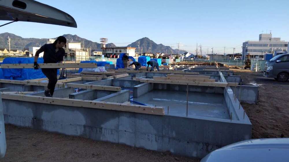 【南棟】ベタ基礎という基礎で、建物の床下全体に鉄筋コンクリートを流し込んでつくる基礎が完了し、基礎の立ち上がり部分の型枠が設置されて、コンクリート打設が行われています。