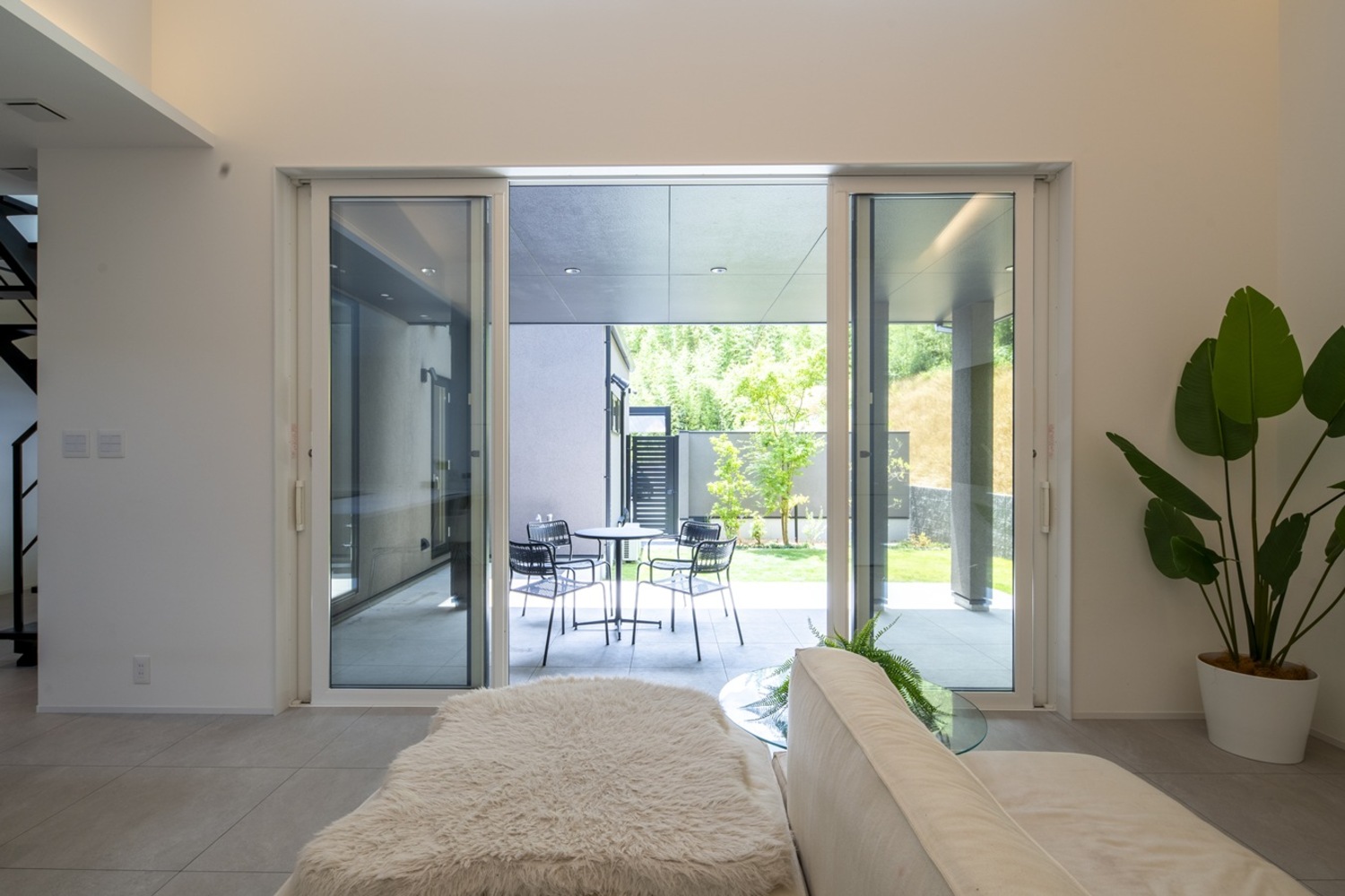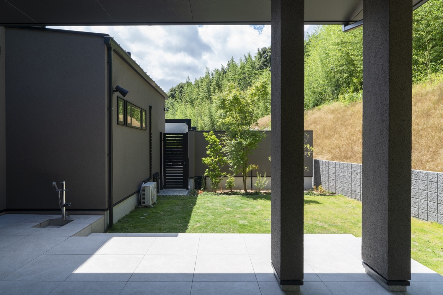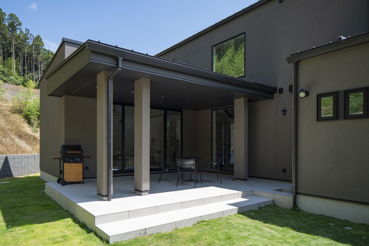 重厚感のあるジョリパットの外壁材が、自然豊かなロケーションにしっかりと馴染みながらも、存在感を放つ美しい外観。