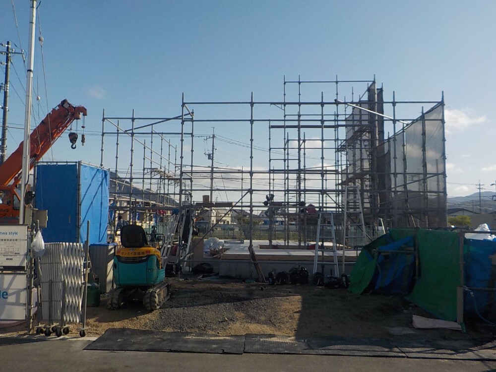 土台の上に柱が次々に立ち始め、作業が着々と進められています。