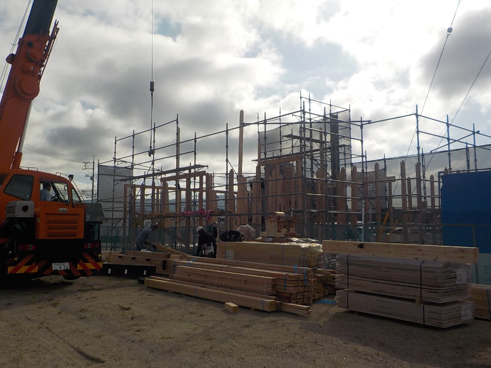 クレーンで木材を下す業者さんを大工さんとの見事な連携でどんどん作業が進んでいますね!
